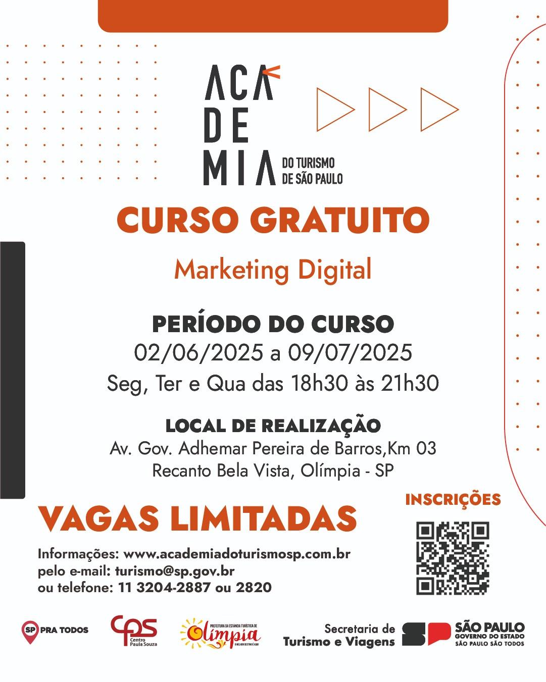 A Estância Turística de Olímpia, primeiro destino paulista a se tornar distrito turístico, segue fortalecendo seu desenvolvimento com novas oportunidades de qualificação profissional. Como parte das ações da Academia do Turismo SP, estão abertas as inscrições para dois cursos gratuitos: Espanhol para Recepção e Marketing Digital.