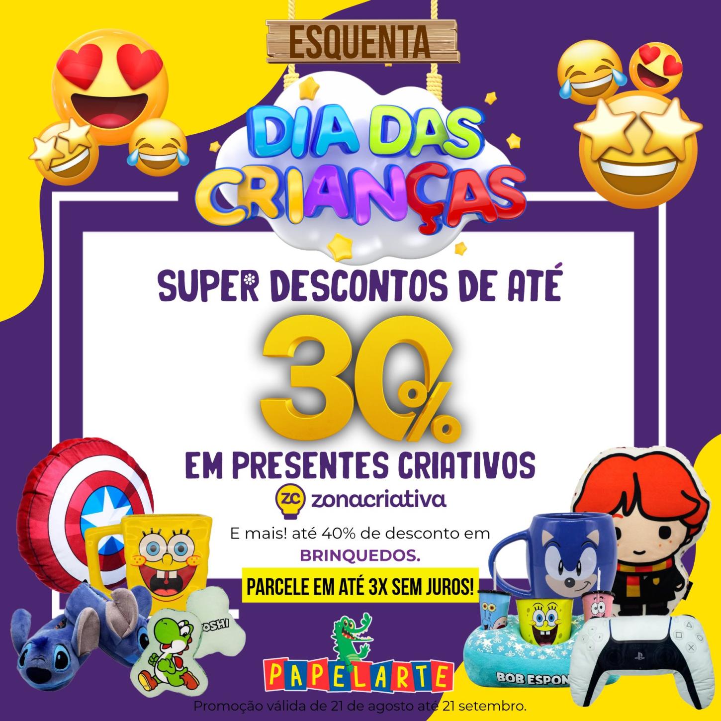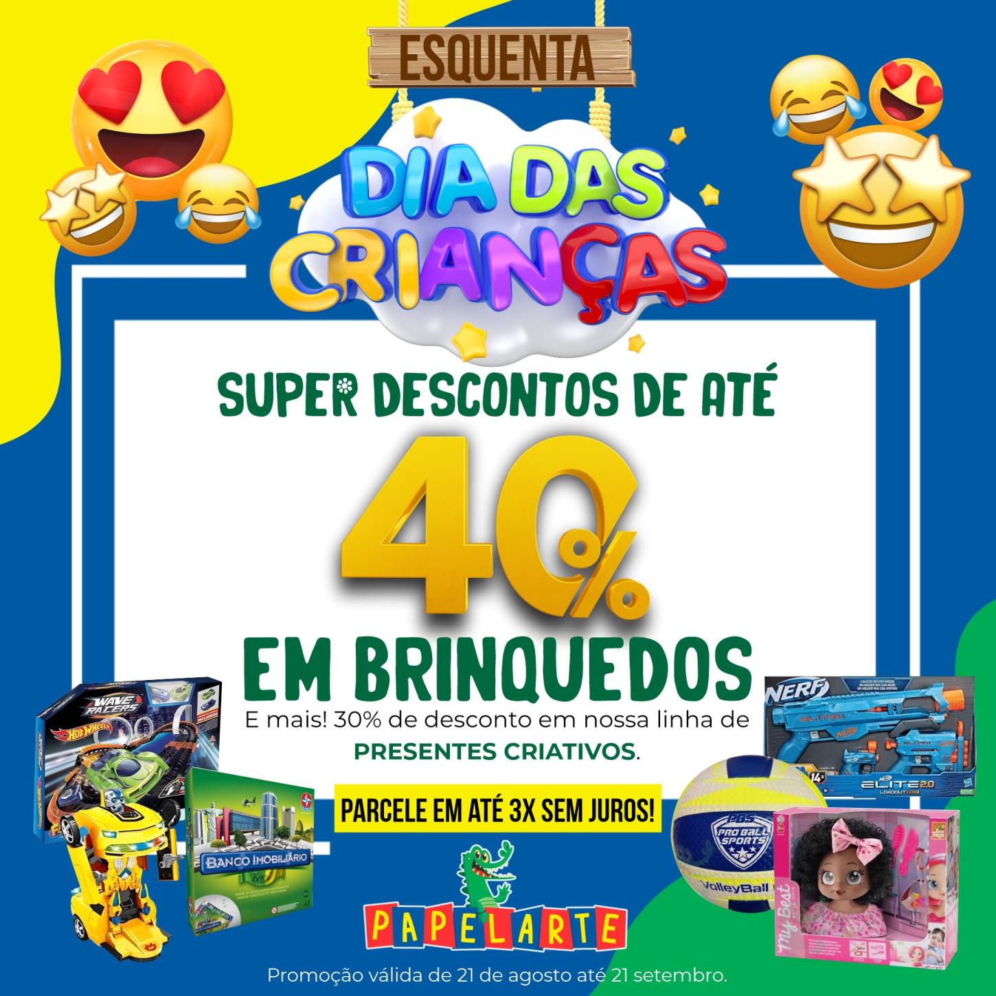 É isso mesmo, começou o “Esquenta do Dia das Crianças” na Papelarte, com descontos incríveis de até 40% em brinquedos! Uma oportunidade única para garantir a alegria da garotada com brinquedos de qualidade por um preço super especial.