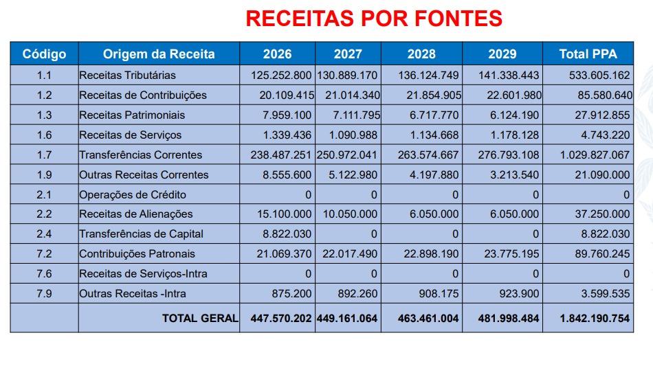 A evolução orçamentária prevista representa um acréscimo anual médio de R$ 11,47 milhões, impulsionado por aumento de receitas tributárias, que devem crescer 12,8% no período, e de transferências correntes, com avanço estimado de 16%. O PPA também projeta que 76,4% de toda a receita será formada por recursos próprios, enquanto 23,6% virá de convênios e transferências, mantendo a tendência de dependência moderada de repasses externos.