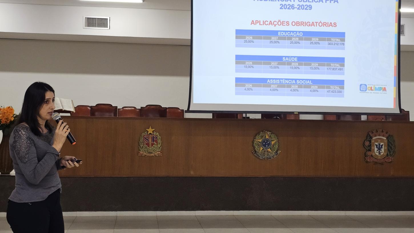 A apresentação foi conduzida por Raquel Navarini, assessora executiva e diretora da Divisão de Planejamento e Execução Orçamentária, com apoio da equipe técnica da Secretaria Municipal de Planejamento e Finanças. Representando o titular da pasta, que está em viagem, a assessora de gabinete Quelle Fernanda Furlanetto atuou como secretária interina.