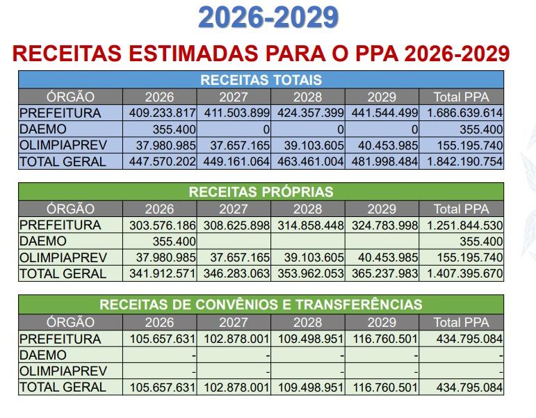 A Prefeitura da Estância Turística de Olímpia projeta um crescimento de 7,7% no orçamento municipal ao longo dos próximos quatro anos, passando de R$ 447,57 milhões em 2026 para R$ 481,99 milhões em 2029. A estimativa faz parte do Plano Plurianual (PPA) 2026-2029, apresentado em audiência pública na noite de quinta-feira (7), na Câmara Municipal. No total, receitas e despesas previstas somam R$ 1,84 bilhão no período, incluindo recursos próprios e transferências. O presidente Flávio Olmos e a vereadora Sonia Guerra estiveram presentes.