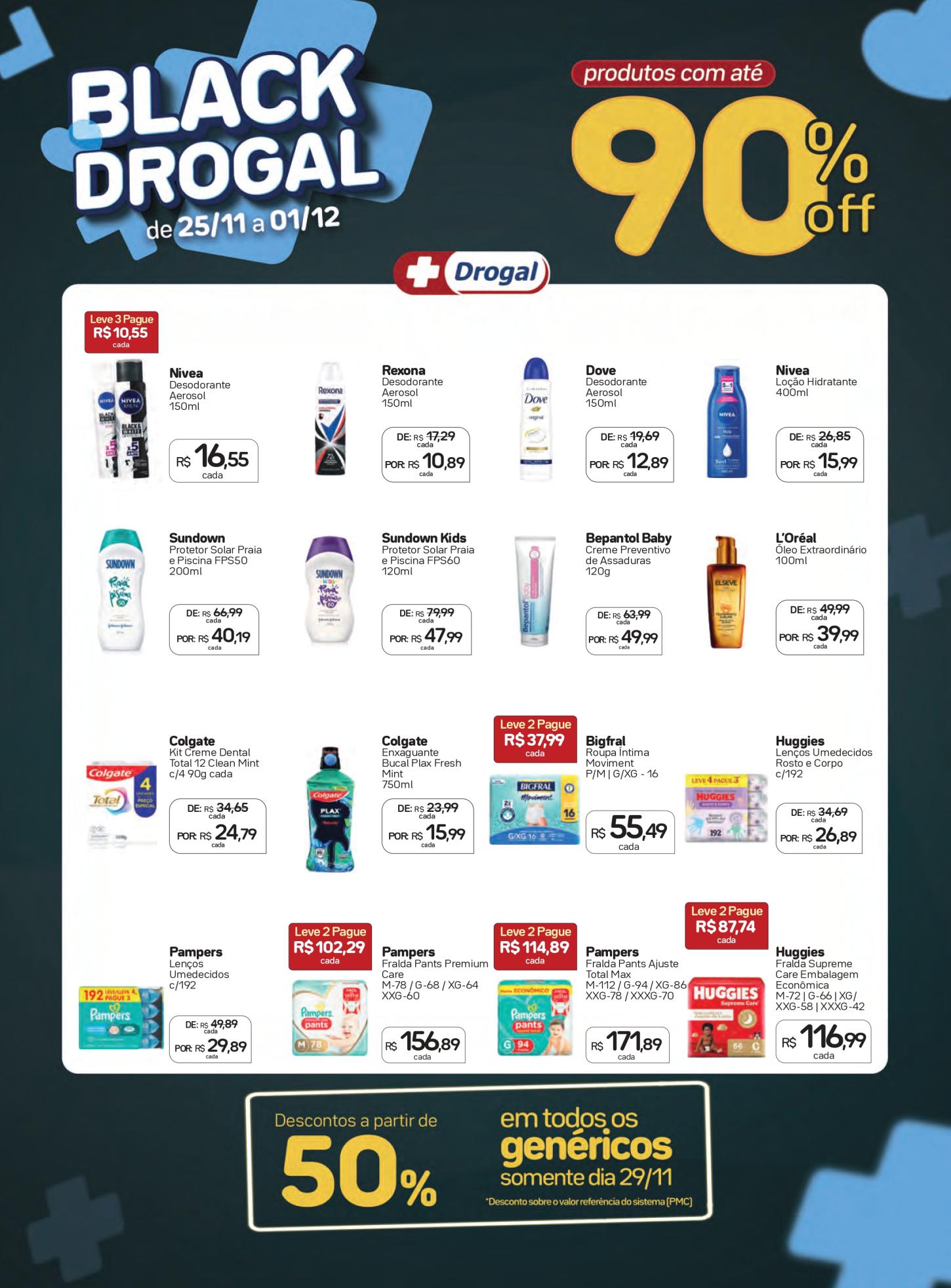 De 25 de novembro a 1º de dezembro, a Black Drogal está trazendo ofertas de arrasar! São produtos com até 90% de desconto e oportunidades únicas para economizar.