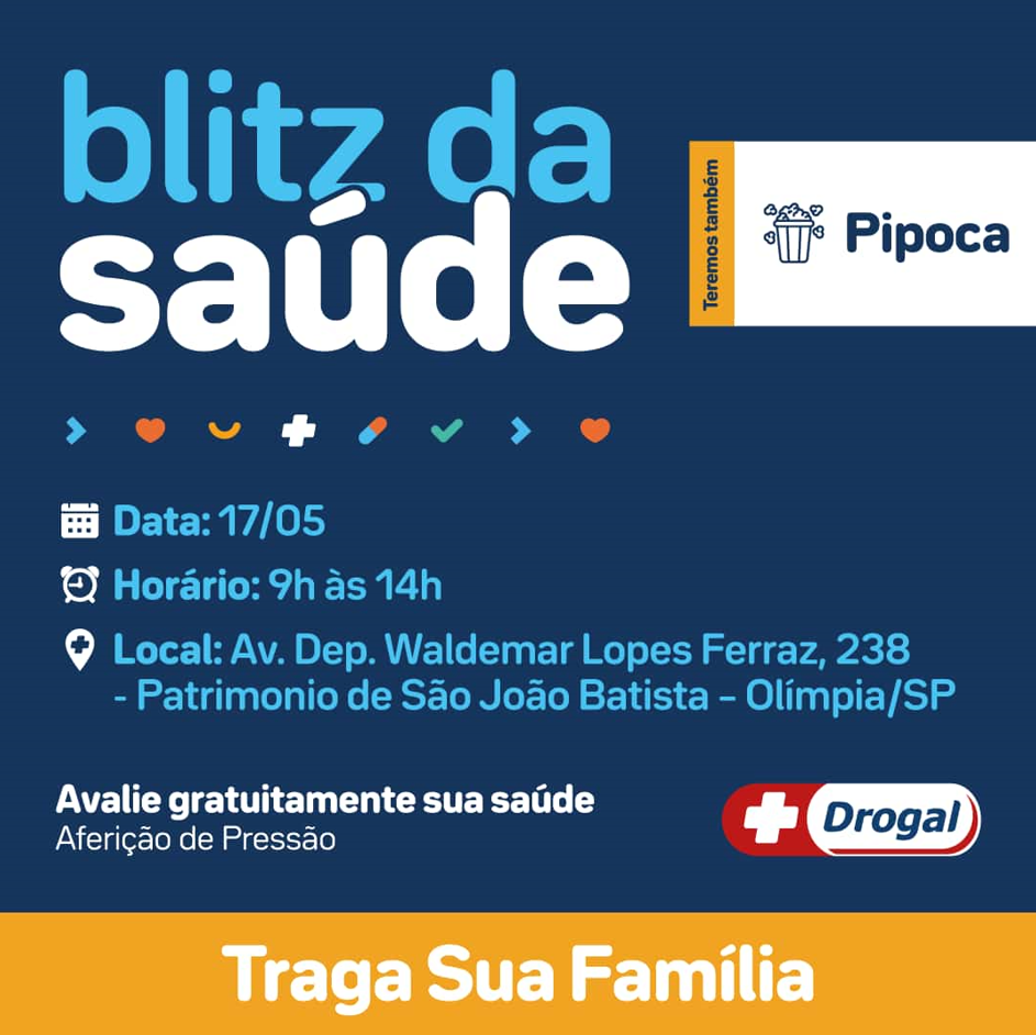 A Drogal está preparando uma blitz da saúde especial para você! Amanhã, dia 17, das 9h às 14h, venha até nossa loja na Av. Waldemar Lopes Ferraz, 238 para aferir sua pressão gratuitamente!