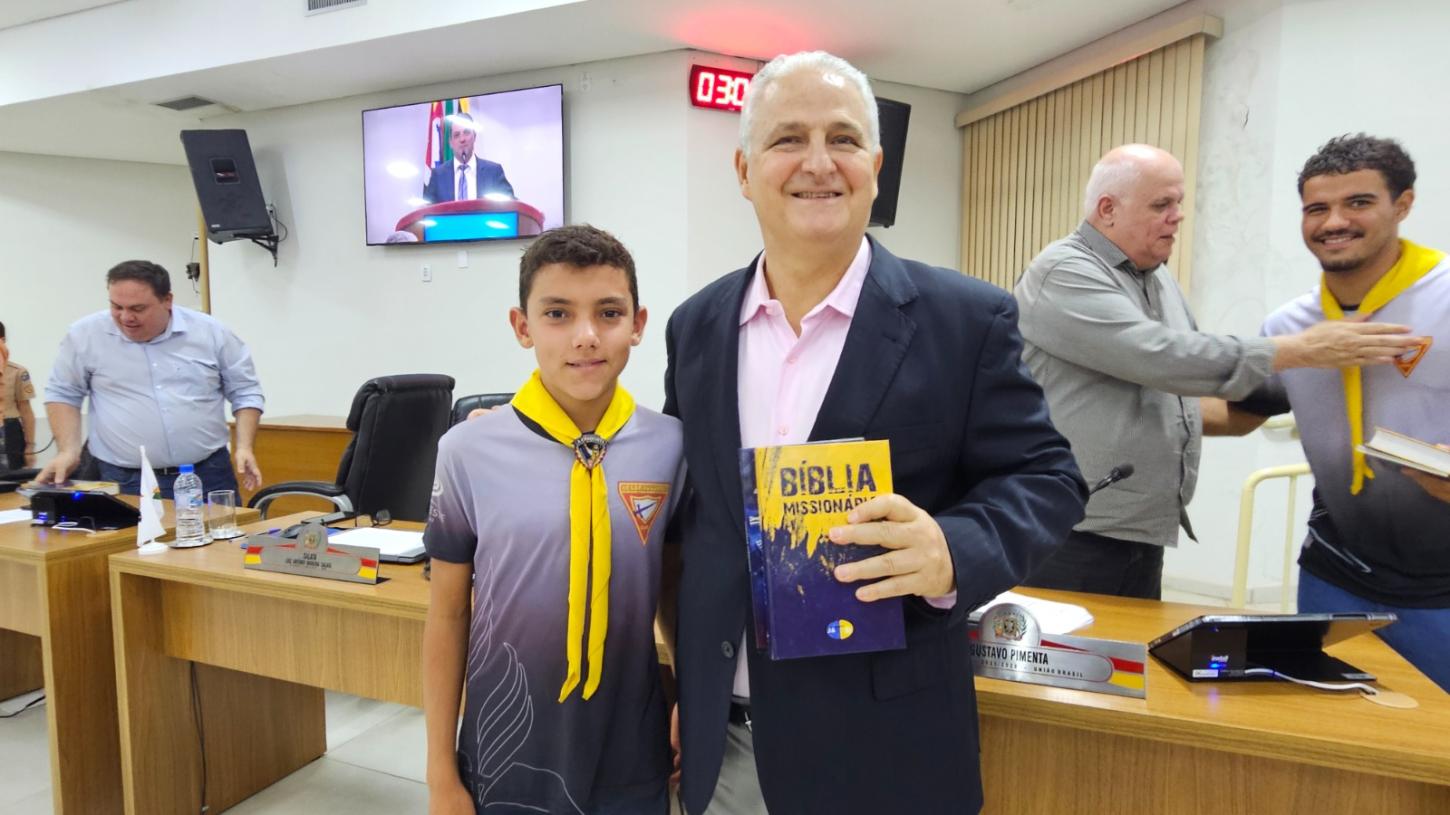 Na sequência, jovens Desbravadores entregaram aos vereadores exemplares da Bíblia e do livro “Contagem Regressiva”, de Alejandro Bullón, livro missionário oficial da Igreja Adventista do Sétimo Dia para o Impacto Esperança 2026
