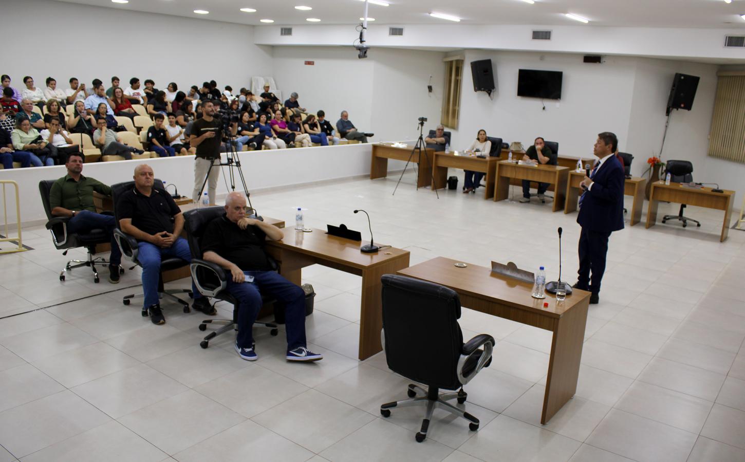 A sessão foi aberta pelo presidente da Câmara, vereador Flávio Olmos, que deu as boas-vindas ao público e destacou o papel do Legislativo na fiscalização e no diálogo com a comunidade.