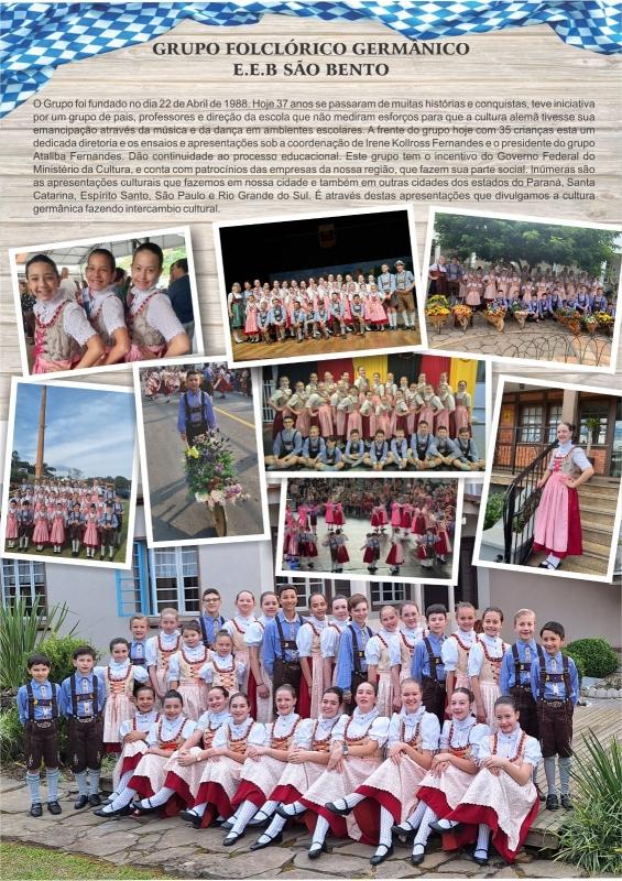 O Grupo E.E.B São Bento, fundado em 1988 na região sul, há 37 anos preserva o legado de colonos alemães vindos para o Brasil no início do séc. XX. Através de coreografias e passos que relembram a cultura germânica, o grupo de 35 crianças, coordenado por Irene Kollross Fernandes e sob a presidência de Ataliba Fernandes, aprendem a valorizar e recontar a história de seus antepassados por meio da arte.