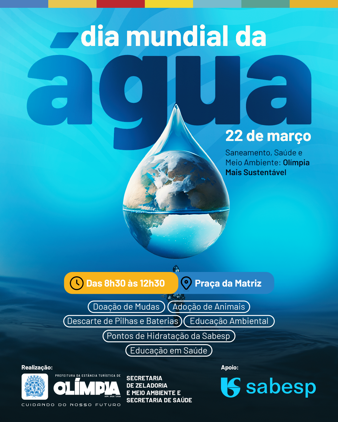 Com o tema “Saneamento, Saúde e Meio Ambiente: Olímpia mais Sustentável”, a ação é uma realização da Prefeitura, por meio da Secretarias de Zeladoria e Meio Ambiente e de Saúde, contando com o apoio ainda da Sabesp, que acaba de completar um ano de operação dos serviços de água e esgoto no município.