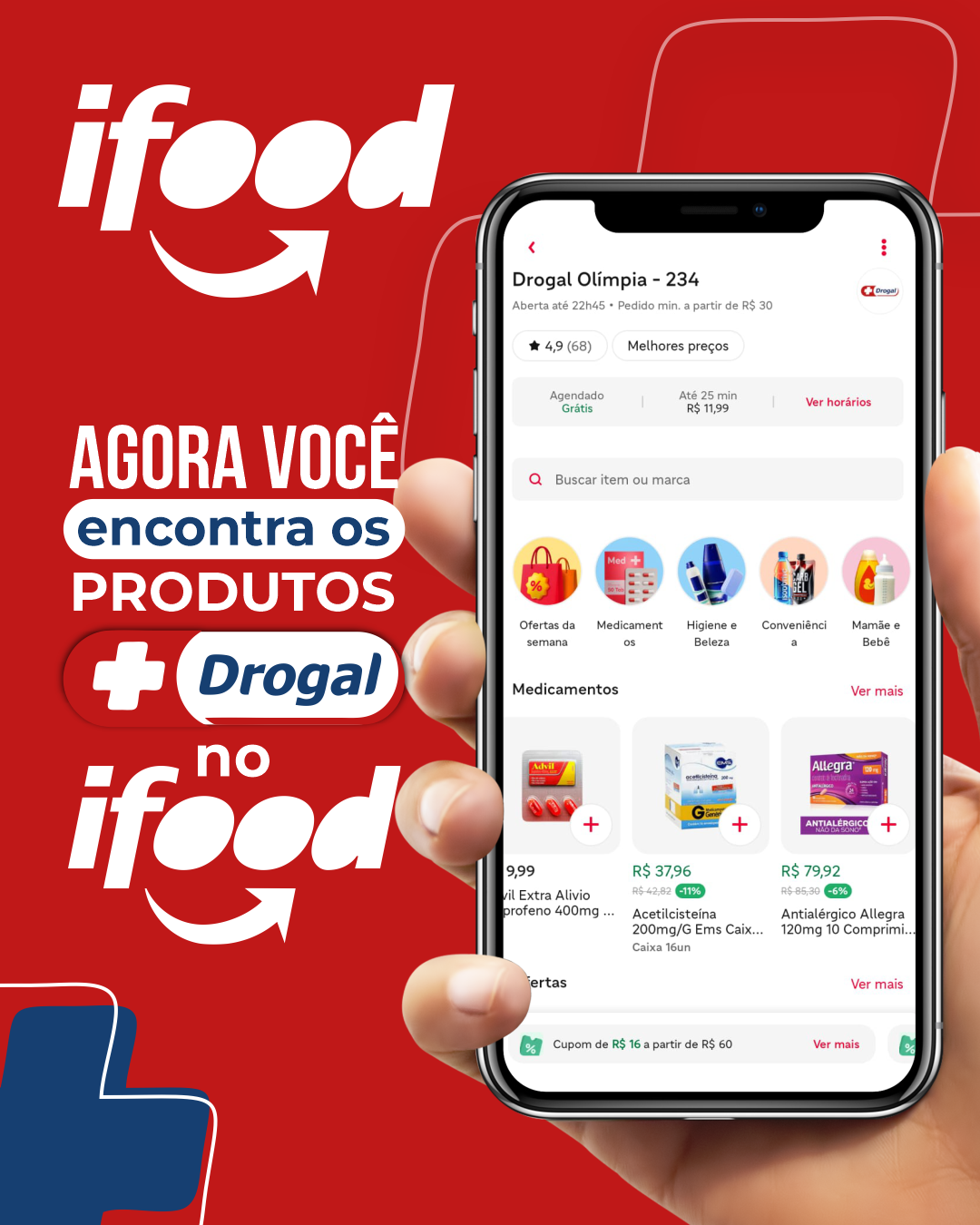 📱 Outra facilidade é que a Drogal também está disponível no iFood, levando praticidade para o seu dia a dia: