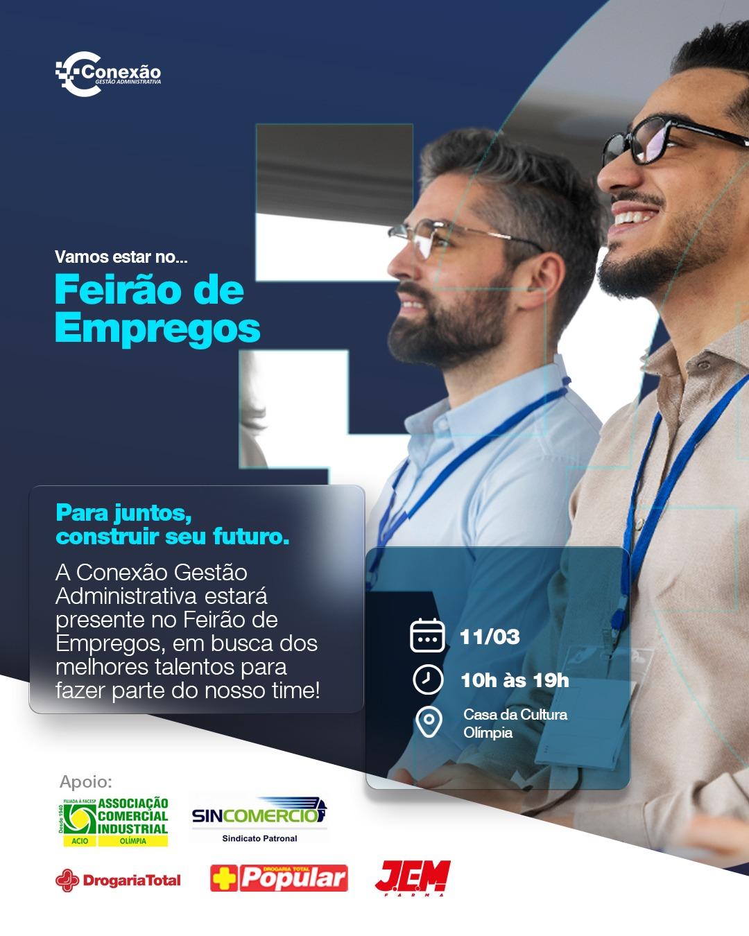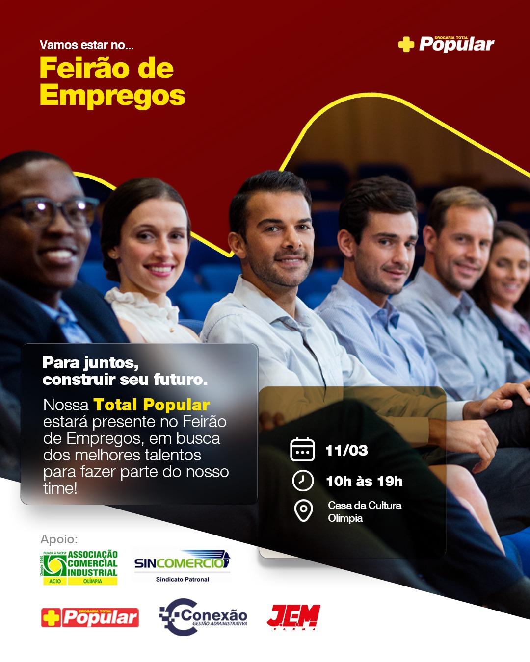 No dia 11 de março, das 10h às 19h, na Casa da Cultura de Olímpia, acontece o Feirão de Empregos, e as empresas Drogaria Total, Total Popular e Conexão - Gestão Administrativa estarão lá em busca dos melhores talentos para integrar suas equipes!