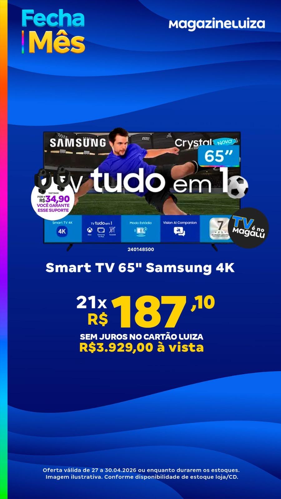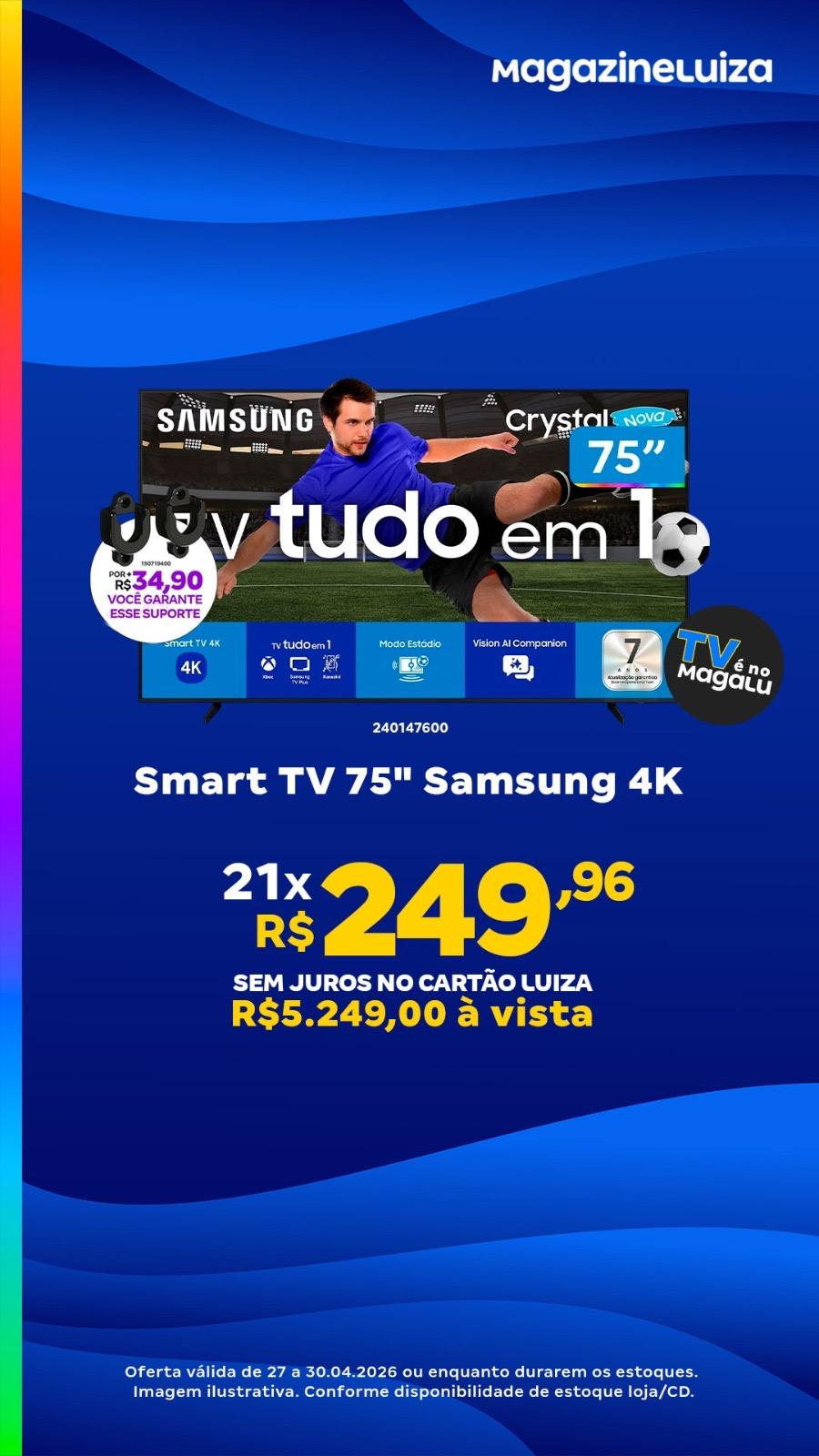 Entre os destaques está a Smart TV Samsung 65” 4K, com parcelamento em até 21 vezes sem juros. Também entram na lista a versão de 55” da mesma linha e a Smart TV 32” da Semp, voltada para quem busca um modelo mais compacto e acessível.