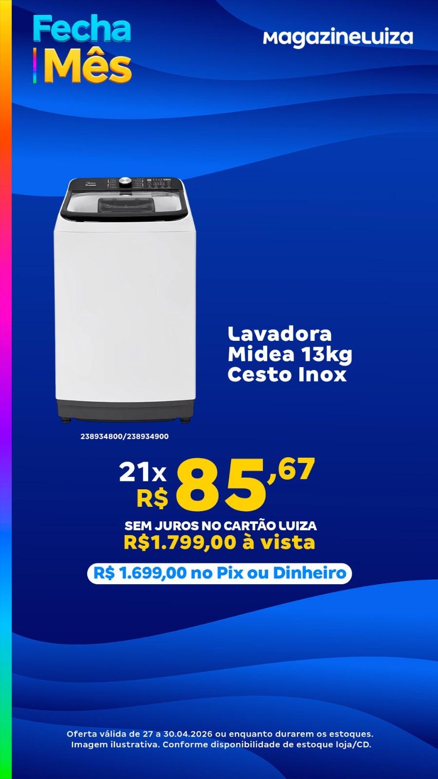 Na linha de eletrodomésticos, a lavadora Midea 13kg com cesto inox aparece como uma opção eficiente para o dia a dia, enquanto a geladeira LG Frost Free 375 litros oferece praticidade e economia para as famílias.