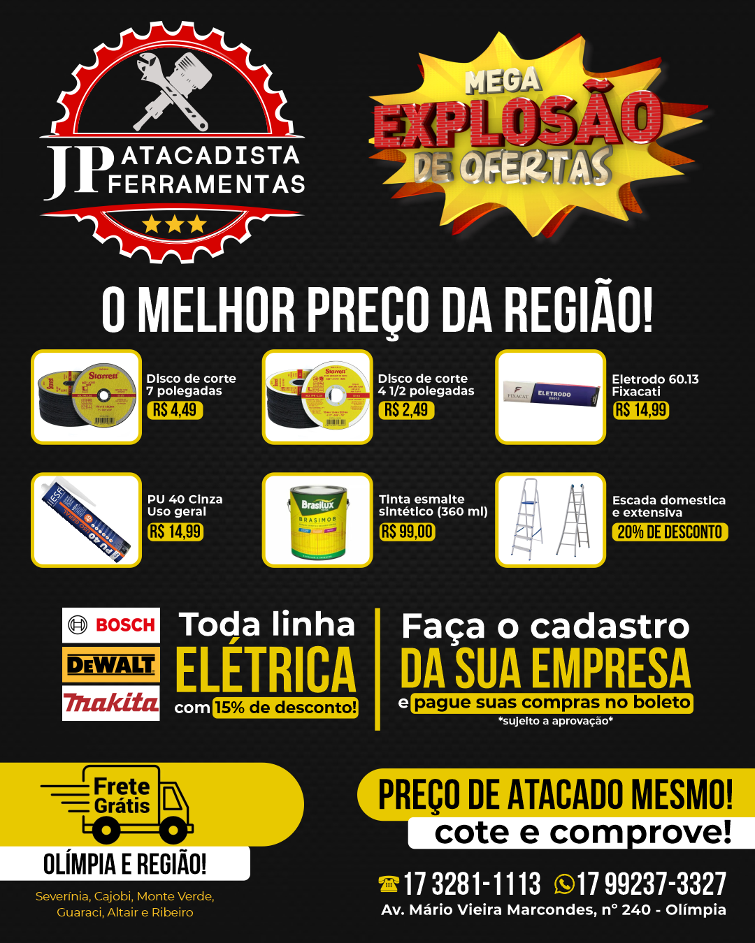 A JP Ferramentas e Atacadista reforça seu compromisso em oferecer os melhores preços da região. Para mais informações ou cotações, entre em contato pelo WhatsApp (17) 99237-3327 e garanta as melhores condições para suas compras.