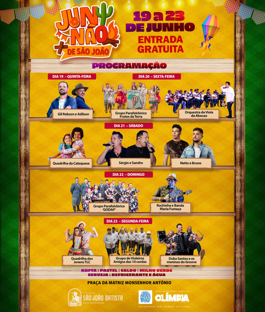 No sábado, dia 21, a programação segue com a Quadrilha da Catequese da paróquia e shows das duplas Sérgio & Sandro e Netto & Bruno. No domingo (22), haverá apresentações culturais do Grupo Olimpiense de Danças Parafolclóricas “Cidade Menina Moça” – Godap e do artista Rochinha e banda Maria Fumaça.