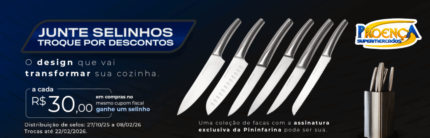 Comece a juntar seus selinhos e acompanhe os modelos disponíveis. A promoção já está em andamento — não deixe para depois. Cada R$ 30 em compras vale um selinho mais próximo da sua coleção de facas Pininfarina.