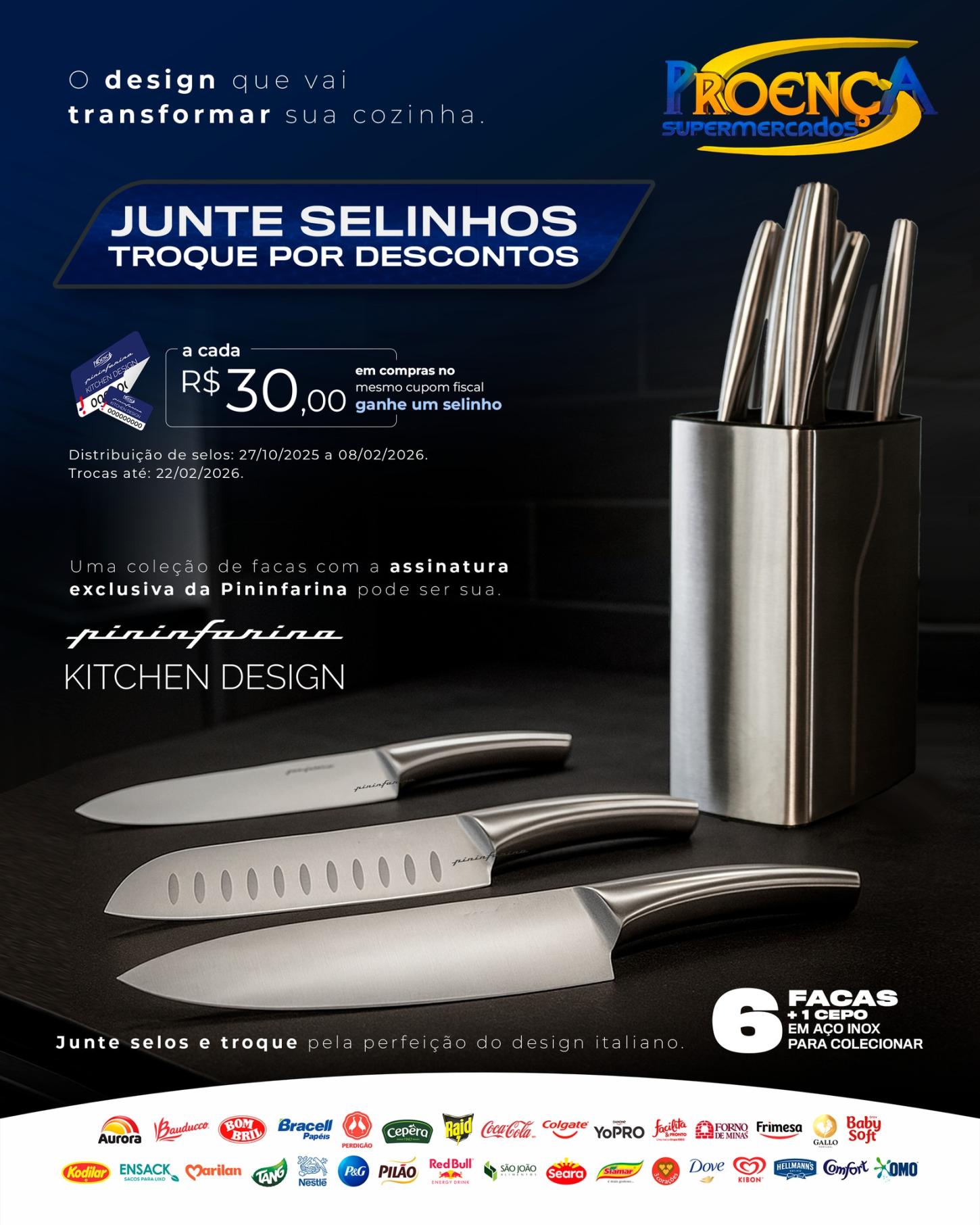 O Proença Supermercados acaba de dar o pontapé em uma campanha especial que une compras do dia a dia e elegância na cozinha: a cada R$ 30 em compras no mesmo cupom fiscal, o cliente ganha um “selinho” da promoção. Os selinhos podem ser trocados por descontos exclusivos em peças da coleção premium da italiana Pininfarina, consagrada por unir design sofisticado e desempenho profissional.