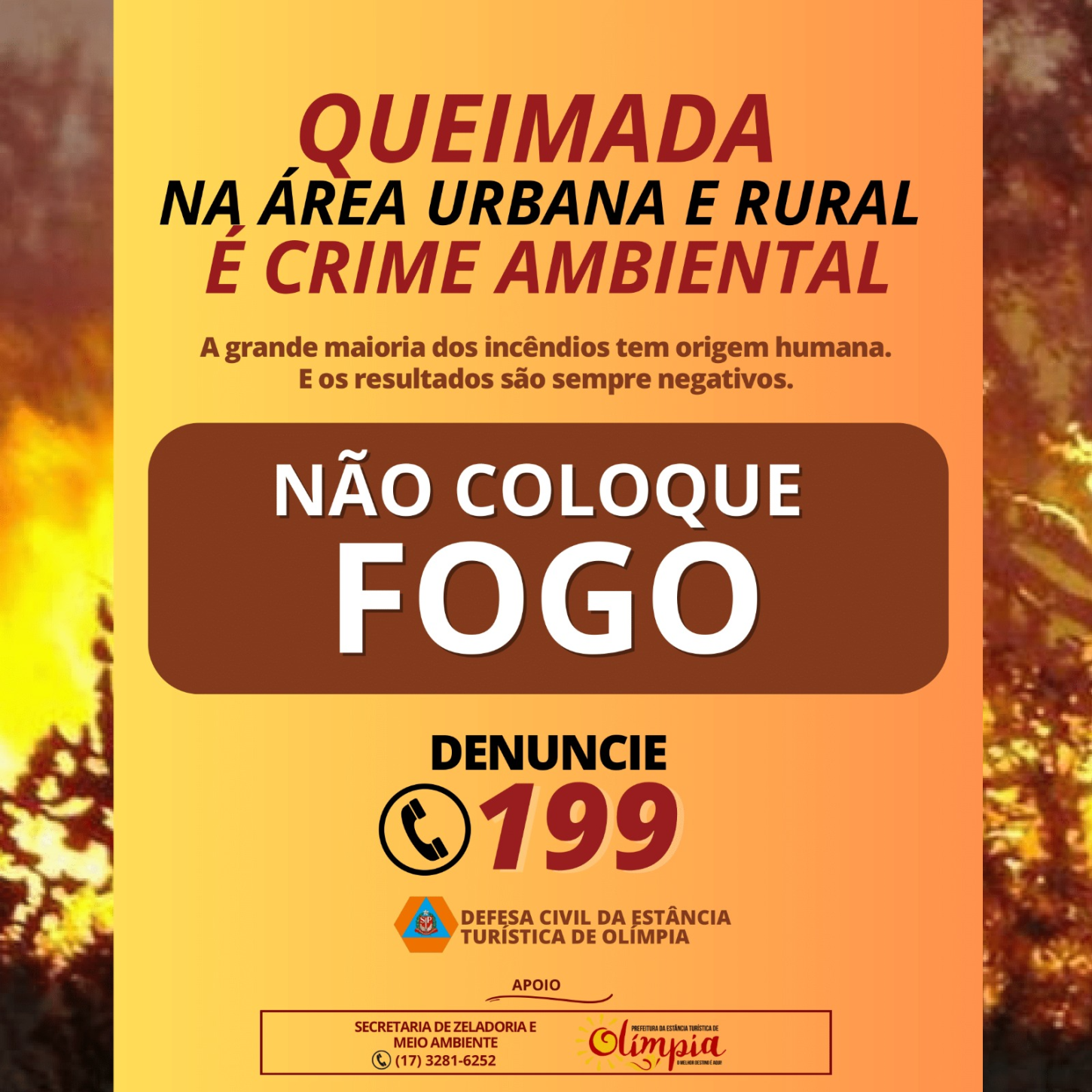 A Prefeitura da Estância Turística de Olímpia, por meio da Defesa Civil e da secretaria de Zeladoria e Meio Ambiente, orienta os moradores sobre os cuidados e a proibição de colocar fogo em terrenos, lixos, entulhos e resíduos, provocando incêndios. O alerta tem o objetivo de conscientizar a população sobre os riscos à saúde e à segurança causados por queimadas em áreas urbanas e rurais neste período de seca e estiagem.