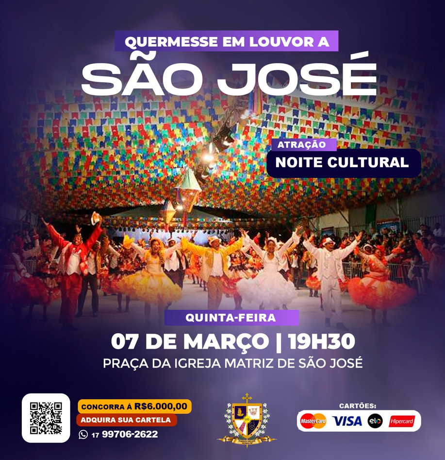 Venha participar da nossa emocionante quermesse em homenagem a São José! Hoje, dia 07 de março, a partir das 19h30, teremos uma programação especial para celebrar essa data tão significativa. Teremos uma apresentação especial com a "Noite Cultural", repleta de música, dança e arte para encantar todos os presentes.