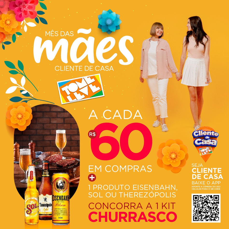 E ainda tem o Mês das Mães clientes de casa, a cada R$60,00 em compras e mais um produto Eisenbahn, Sol ou Terezópolis, você concorre a 1 Kit Churrasco.