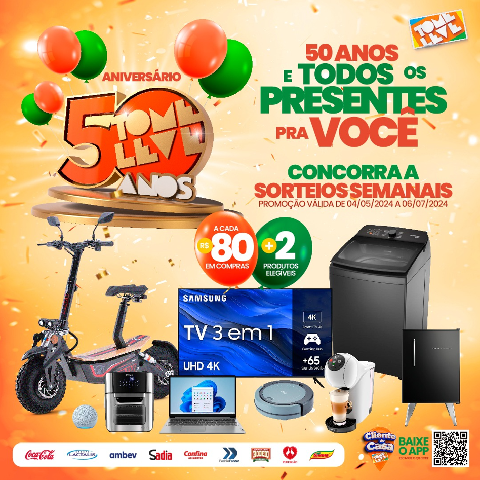 E as novidades não param por aí. O Tome Leve faz 50 anos e todos os presentes são para você! A cada R$80,00 em compras + dois produtos elegíveis (confira na loja), concorra a sorteios semanais de diversos prêmios. A promoção de aniversário é válida de 04 de maio a 06 de julho, aproveite!