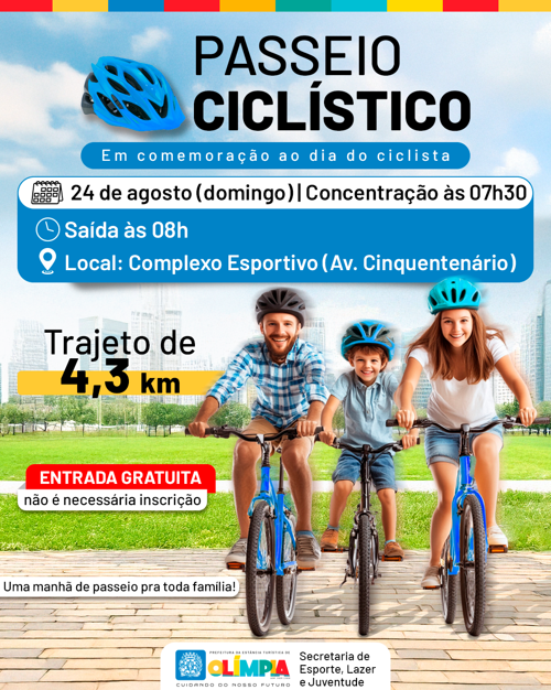 A Prefeitura da Estância Turística de Olímpia, por meio da Secretaria de Esporte, Lazer e Juventude, irá promover um passeio ciclístico em comemoração ao Dia do Ciclista. O passeio será realizado no dia 24 de agosto, domingo, com concentração às 7h30 no Complexo Esportivo, localizado na Avenida do Cinquentenário. A largada está prevista para às 8h.