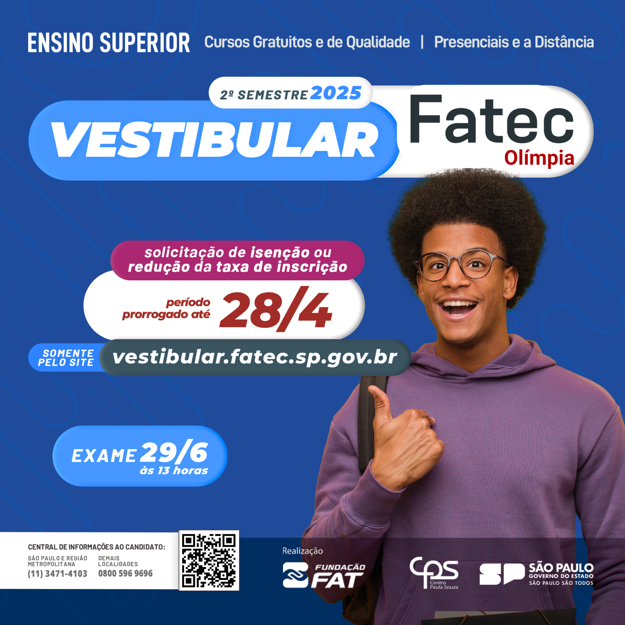 O preenchimento correto e o envio da documentação são de responsabilidade do candidato. Segundo o Centro Paula Souza, serão concedidas até 6 mil isenções. Para redução da taxa, não há limite de vagas. É possível solicitar os dois benefícios, desde que sejam preenchidos ambos os formulários na internet e os candidatos atendam aos requisitos determinados para cada finalidade. Requisitos para isenção É necessário ter concluído o Ensino Médio em 2024 ou estar em curso equivalente, como a Educação de Jovens e Adultos (EJA) ou o Centro Estadual de Jovens e Adultos (Ceeja), no Brasil.