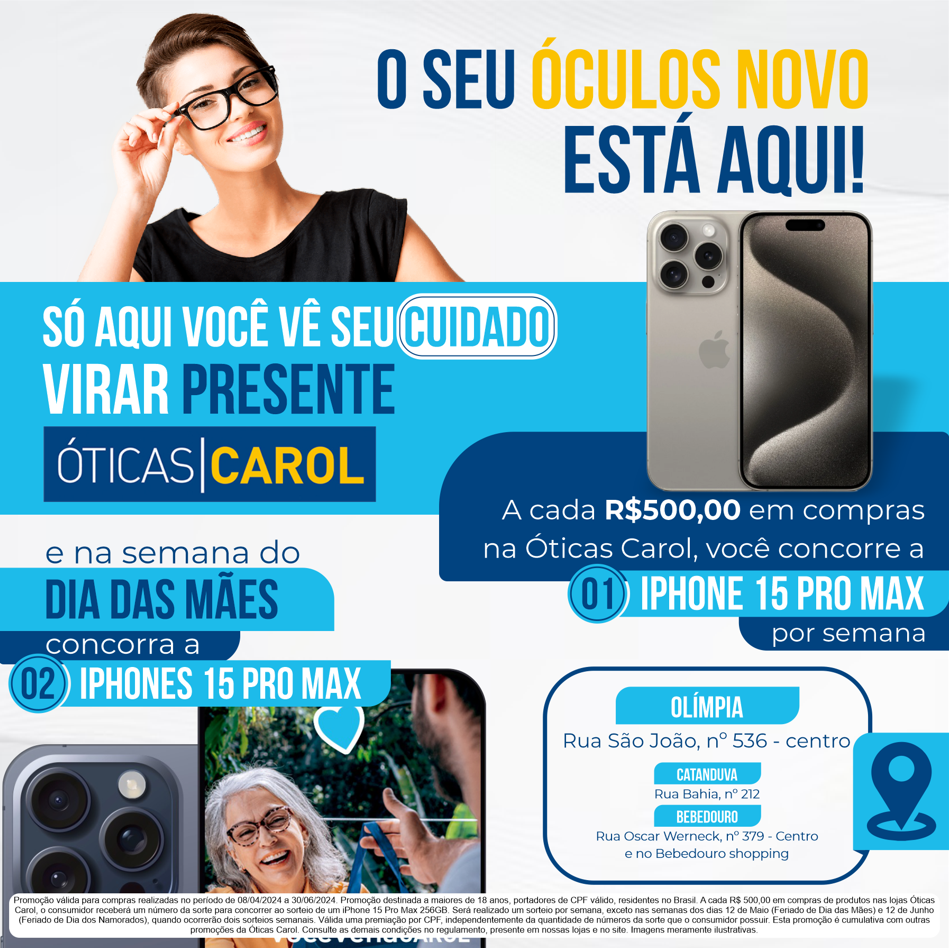 Chegou a hora de transformar seu cuidado em uma chance de ganhar um super presente! A cada R$500 em compras nas Óticas Carol, você concorre a um iPhone 15 Pro Max por semana. E tem mais: durante a semana do Dia das Mães, serão dois iPhones em jogo!