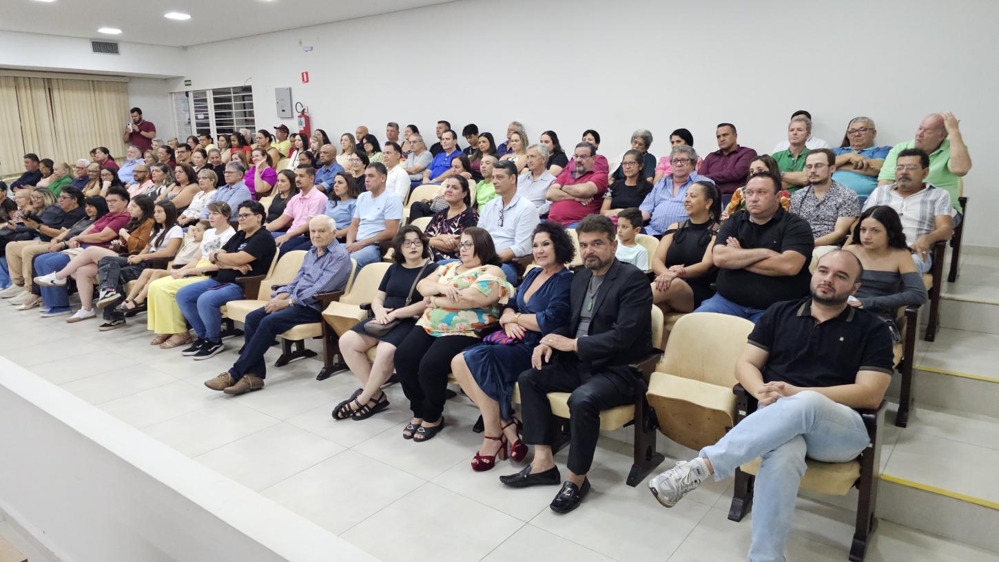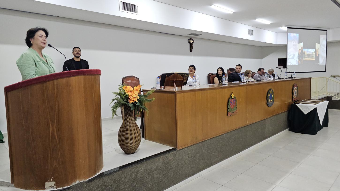 A Câmara Municipal de Olímpia realizou, na noite de terça-feira (21), sessão solene presidida pelo vereador Flávio Augusto Olmos para homenagear duas cidadãs olimpienses: Claudinéia Freire, agraciada com a Comenda do Brasão do Centenário e a Medalha Prefeito Álvaro Marreta Cassiano Ayusso, e Marilza Aparecida Pereira, que recebeu o título Mulher Destaque. O plenário ficou completamente ocupado por familiares, amigos e autoridades locais.