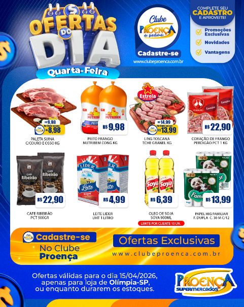 O Proença Supermercados divulgou suas ofertas do dia para esta quarta-feira (15), com uma variedade de produtos em promoção na unidade de Olímpia (SP).