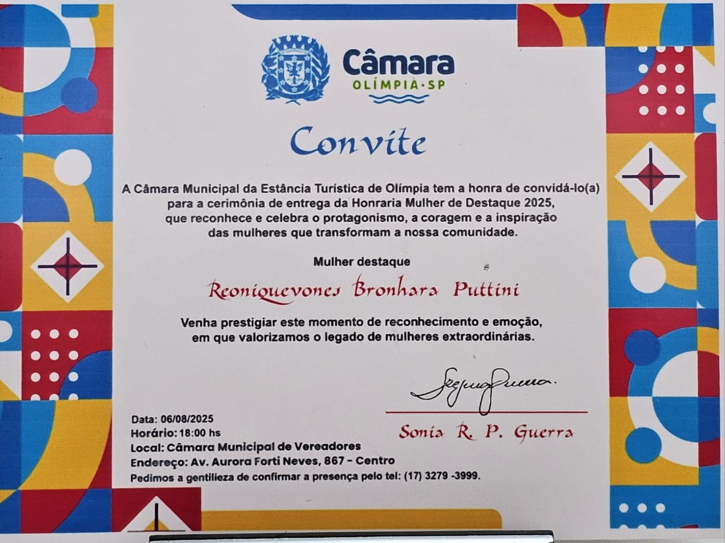 A Câmara Municipal da Estância Turística de Olímpia realiza, nesta quarta-feira (6), sessão solene a partir das 18h para a entrega da honraria Mulher Destaque 2025 à artista e artesã Reoniquevones Bronhara Puttini, conhecida como Reunique. O reconhecimento foi proposto pela vereadora Sônia Guerra e celebra a trajetória de mulheres que contribuem de forma relevante para a comunidade, incentivando e inspirando novas gerações.