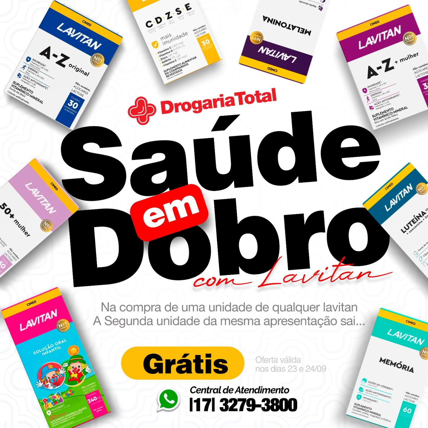 Aproveite essa oferta imperdível e cuide da sua saúde em dobro! Não perca tempo e venha até a Drogaria Total para garantir seus produtos Lavitan. A promoção é válida apenas nos dias 23 e 24 de setembro, então corre pra aproveitar!