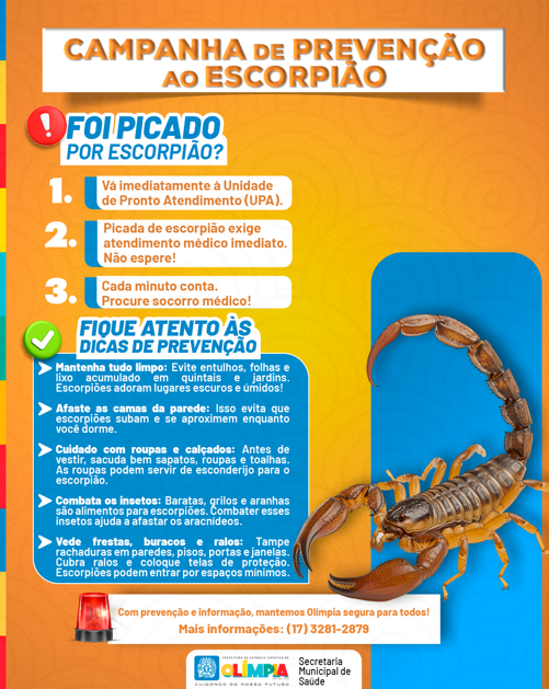 Com o objetivo de alertar a população sobre os riscos de acidentes com escorpiões, o Governo do Estado de São Paulo realiza, entre os dias 25 e 29 de agosto, a Semana de Conscientização e Prevenção de Acidentes Escorpiônicos. Inspirada pela iniciativa estadual, a Prefeitura da Estância Turística de Olímpia, por meio da Secretaria de Saúde e da Divisão de Vigilância em Saúde, promoverá uma ação especial de orientação na Praça da Matriz, neste sábado, dia 30 de agosto, das 8h30 às 12h30.