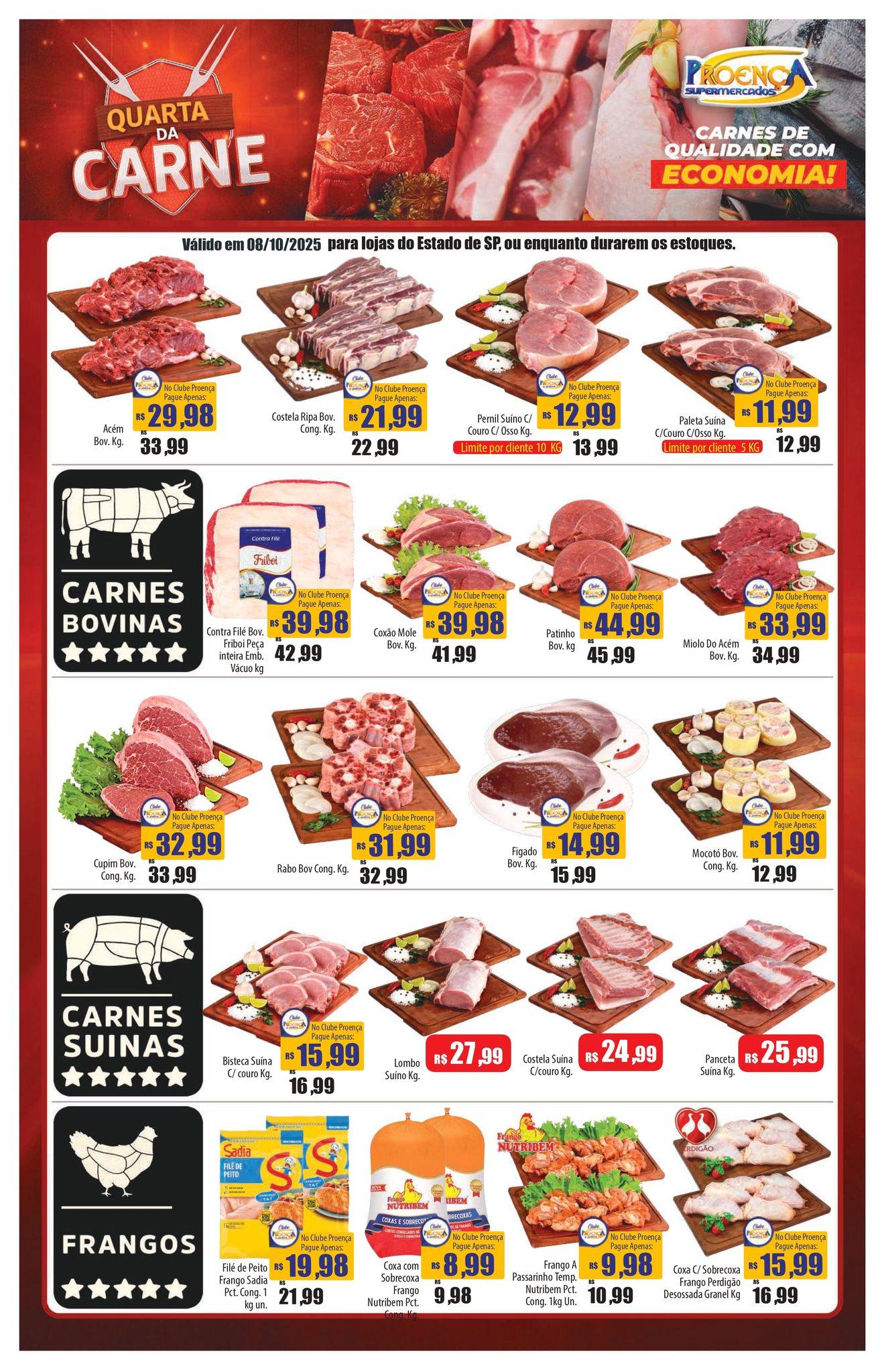 Na Quarta da Carne, o Proença volta com força total: ofertas especiais em carnes bovinas, suínas e aves para você preparar almoço e jantar com sabor e economia. E ainda ofertas aquáticas, frios, hortifrúti, bebidas e complementos.