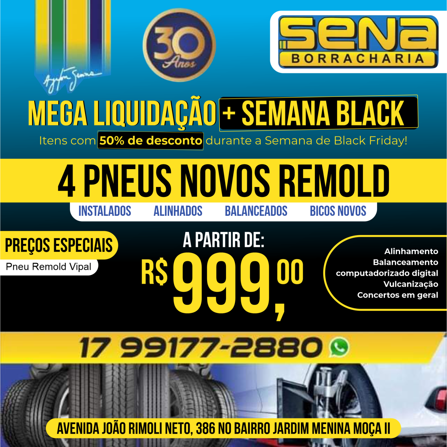 4 pneus instalados, alinhados e balanceados com bico novo a partir de R$ 999,00.