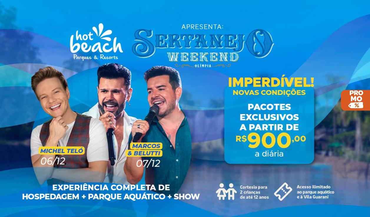 Quem é fã de sertanejo e está em busca de uma experiência musical exclusiva, em um cenário de entretenimento, tem de reservar já o Sertanejo Weekend que será realizado no Hot Beach Parques & Resorts, em Olímpia, de 6 a 8 de dezembro. A proposta do festival é de ótimo custo/benefício para famílias: por diárias a partir de R$ 900,00, o pacote inclui hospedagem para casal e até duas crianças de até 12 anos, café da manhã, acesso ao parque aquático Hot Beach Olímpia e à Vila Guarani, além, é claro, dos shows exclusivos de Michel Teló e da dupla Marcos & Belutti.