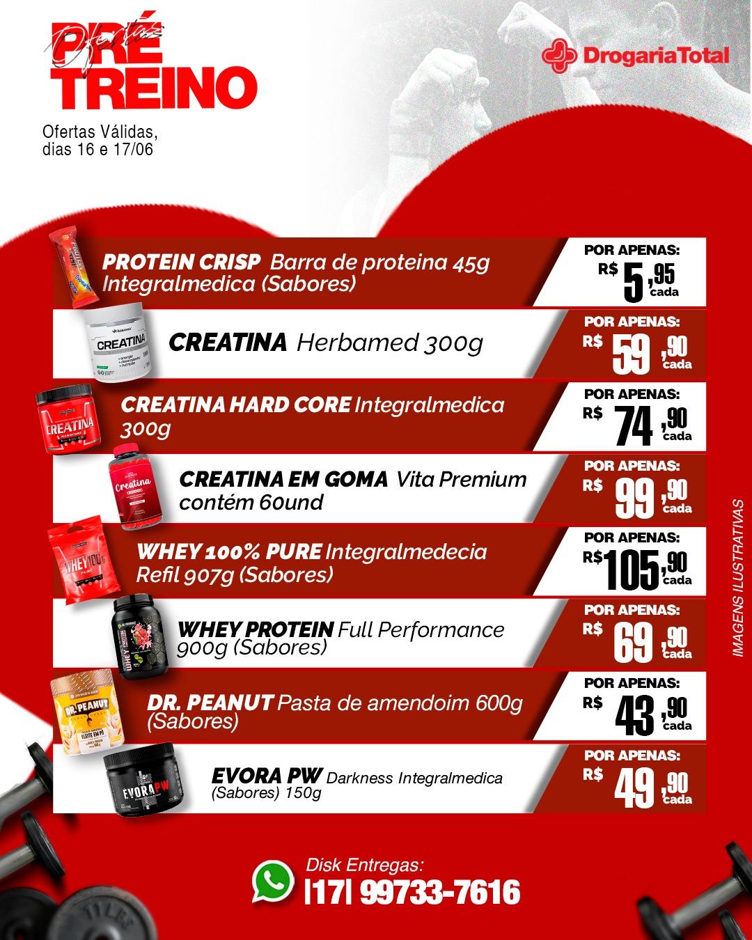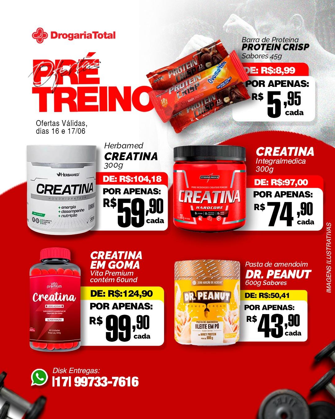 Prontos para um treino poderoso? Na Drogaria Total tem ofertas incríveis de pré-treino para você, amante de academia! Temos uma variedade de produtos como barras de proteína, whey Protein, creatina e muito mais.