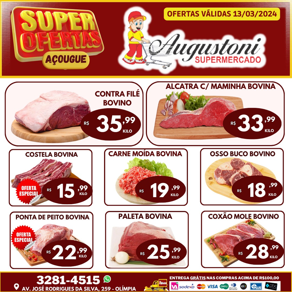 Confira as Super Ofertas para hoje (13 de março) no açougue do Supermercado Augustoni Olímpia.