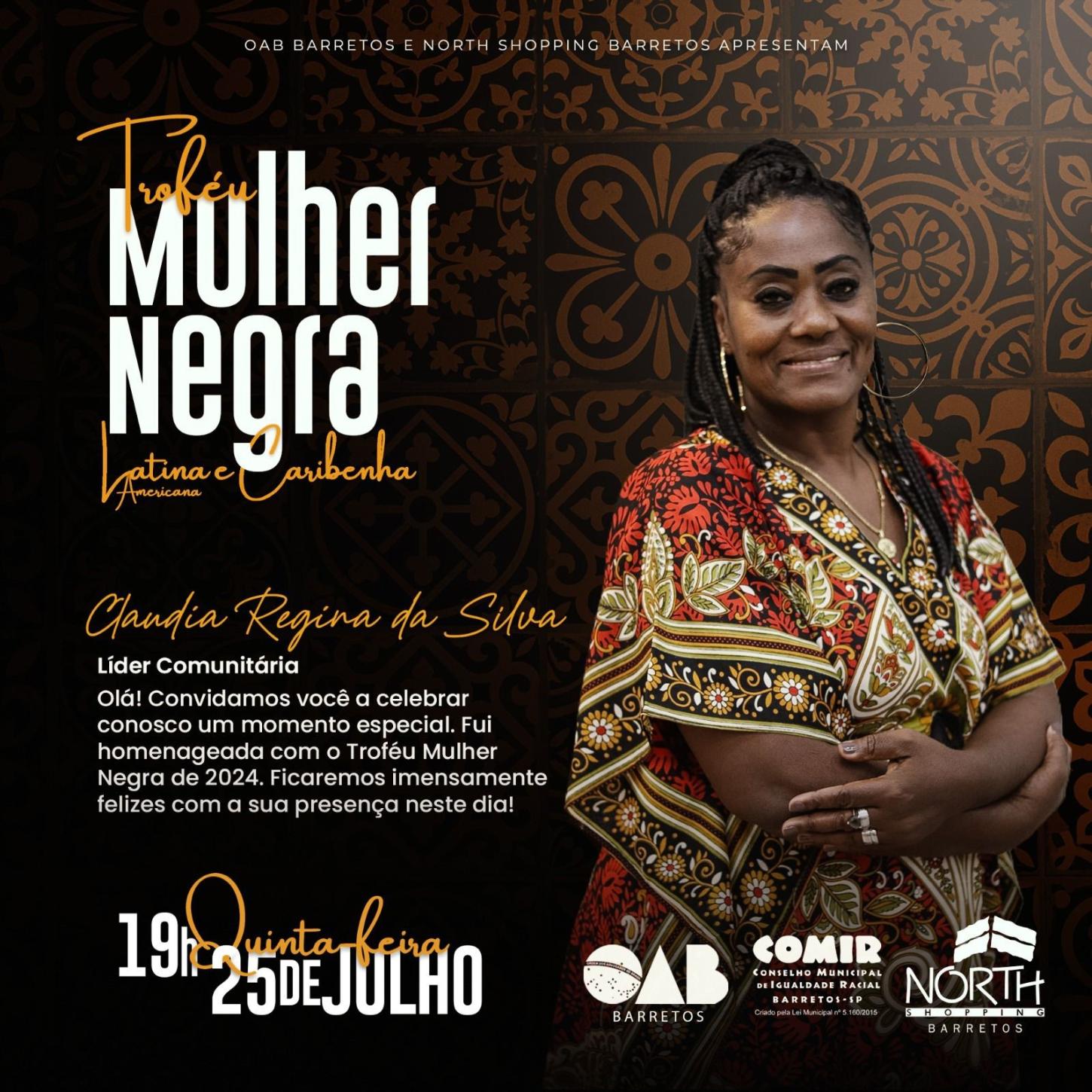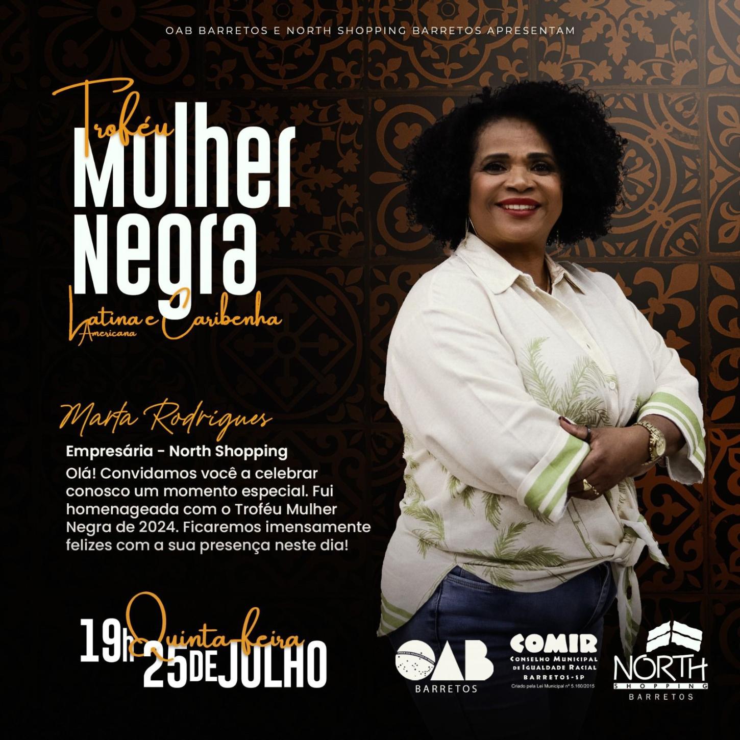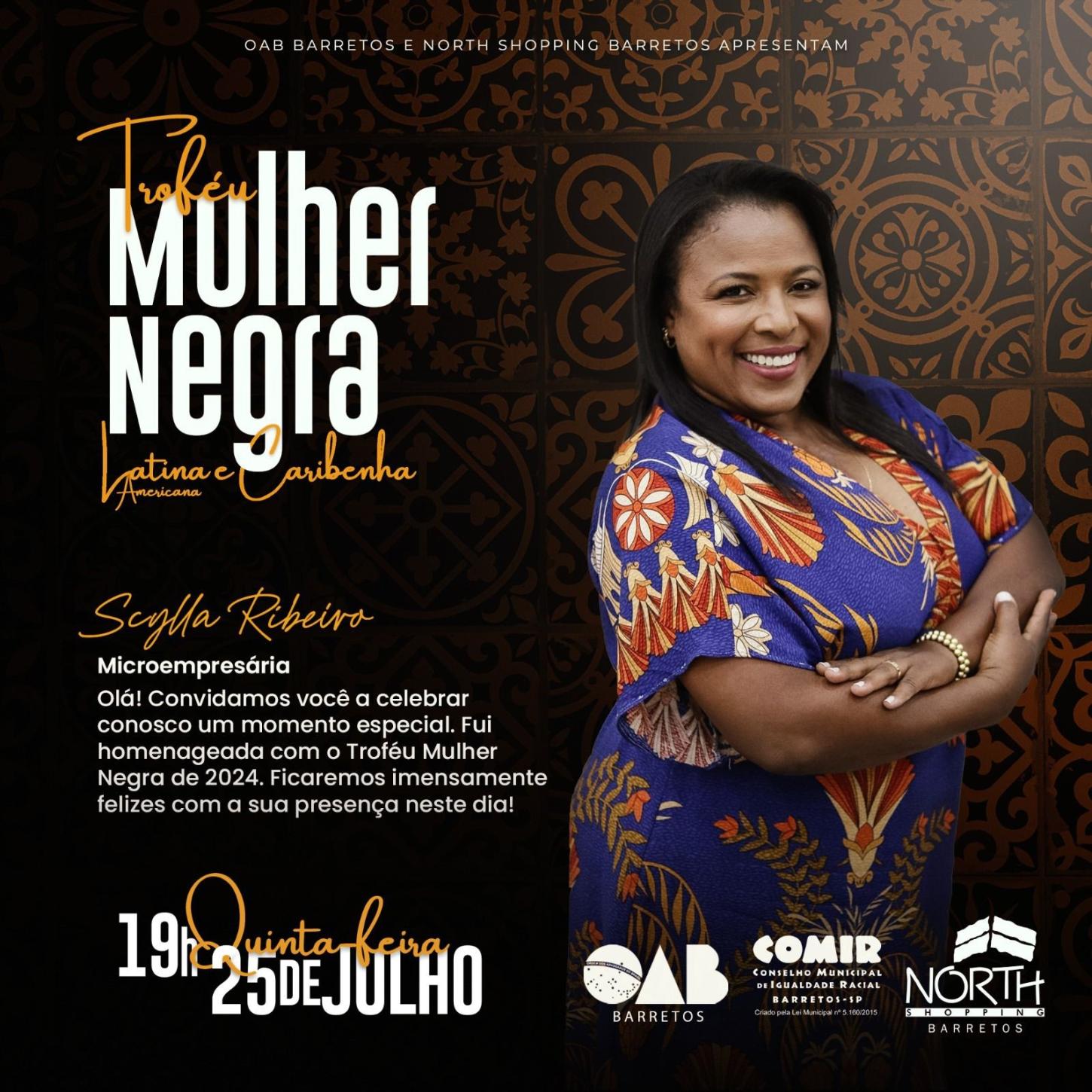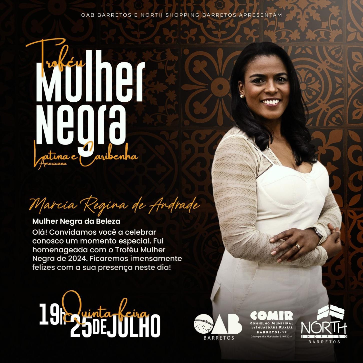 Dez mulheres, com diferentes trajetórias de vida, recebem a homenagem fo “Troféu Mulher Negra Latino-americana e Caribenha 2024”, neste dia 25 de julho, no North Shopping Barretos. A ação celebra a data internacional da "Mulher Negra, Latino-americana e Caribenha” e está em sua terceira edição, realizada neste ano pela Comissão das Mulheres Advogadas da OAB Barretos, em parceria com o COMIR - Conselho Municipal de Igualdade Racial e o North Shopping Barretos.