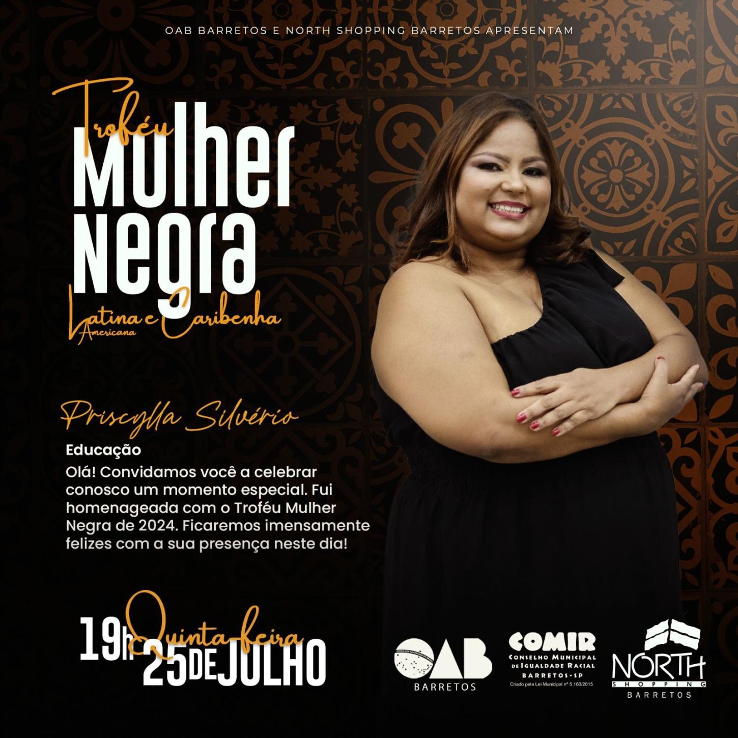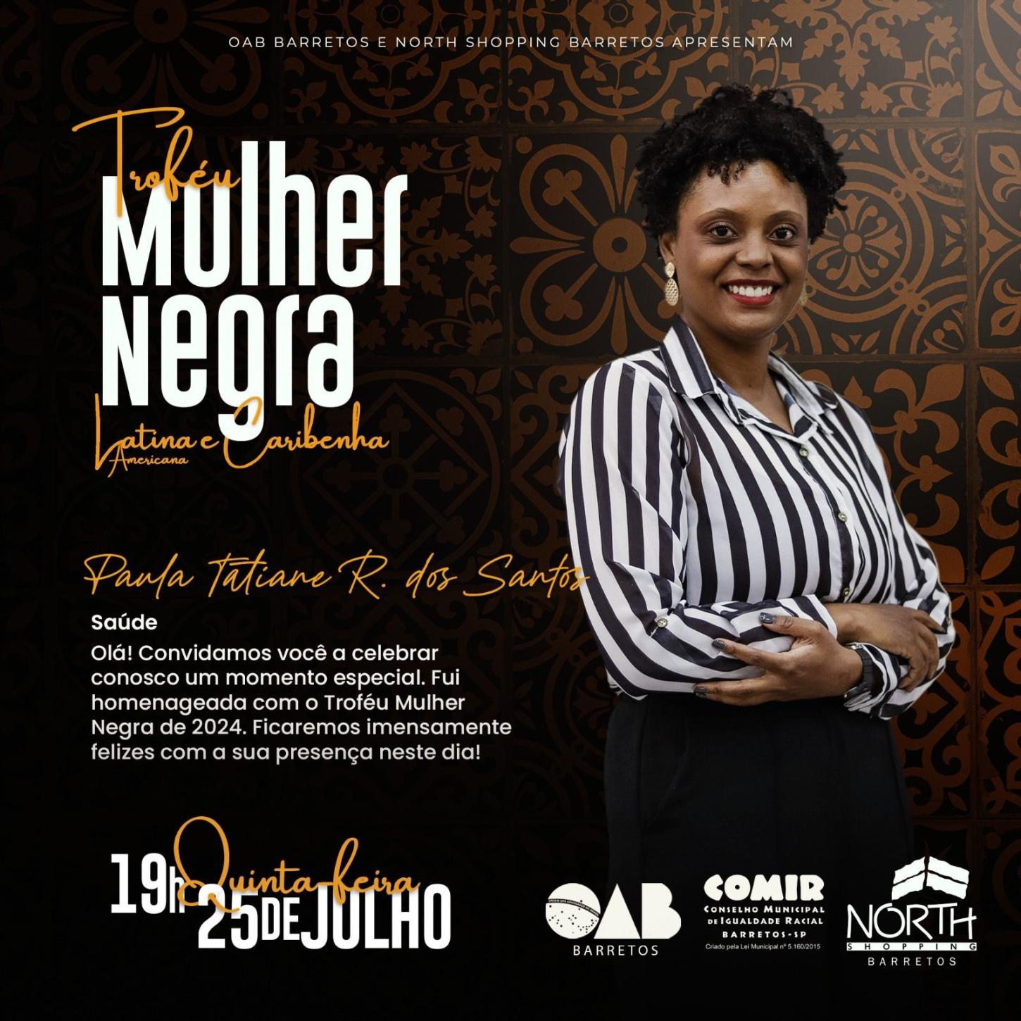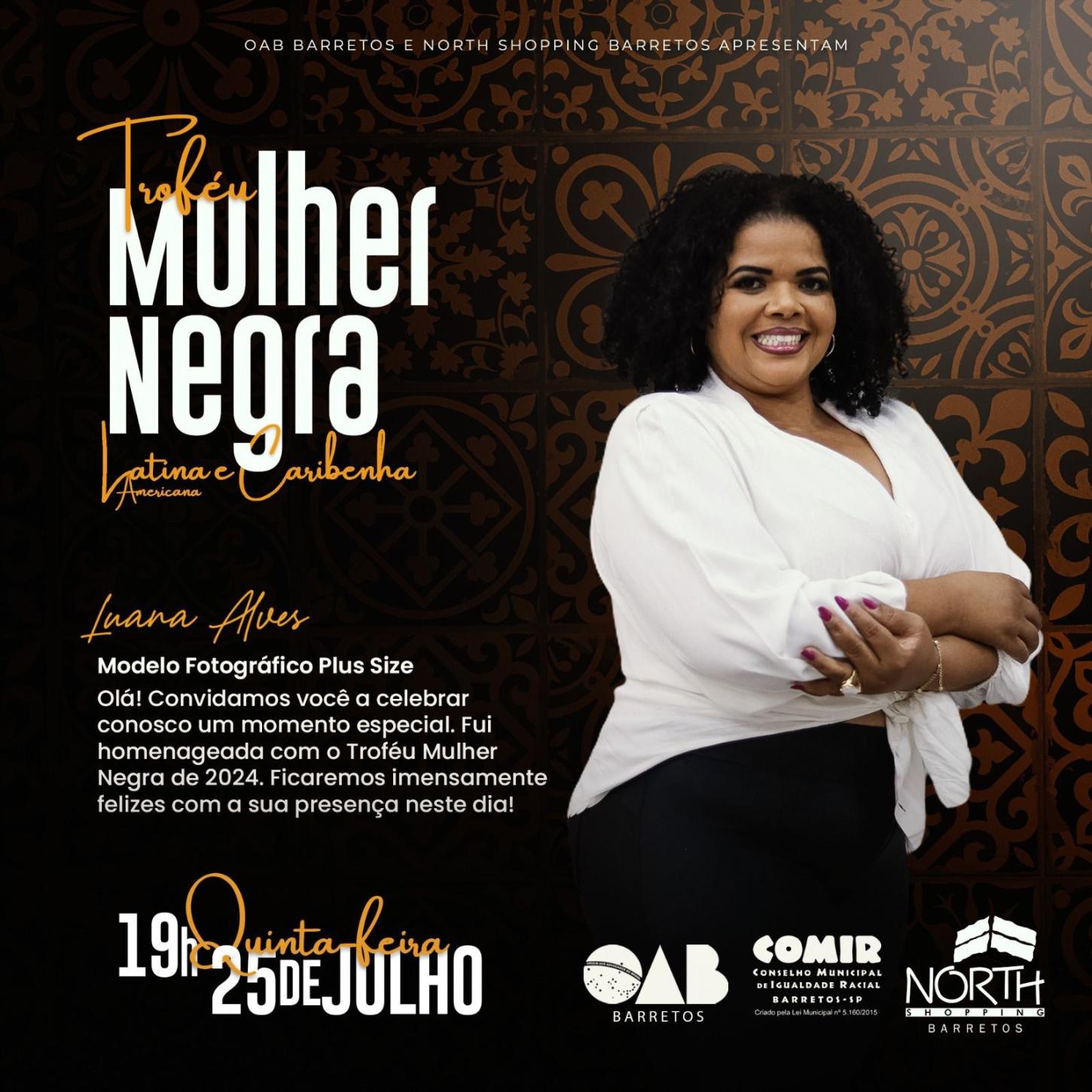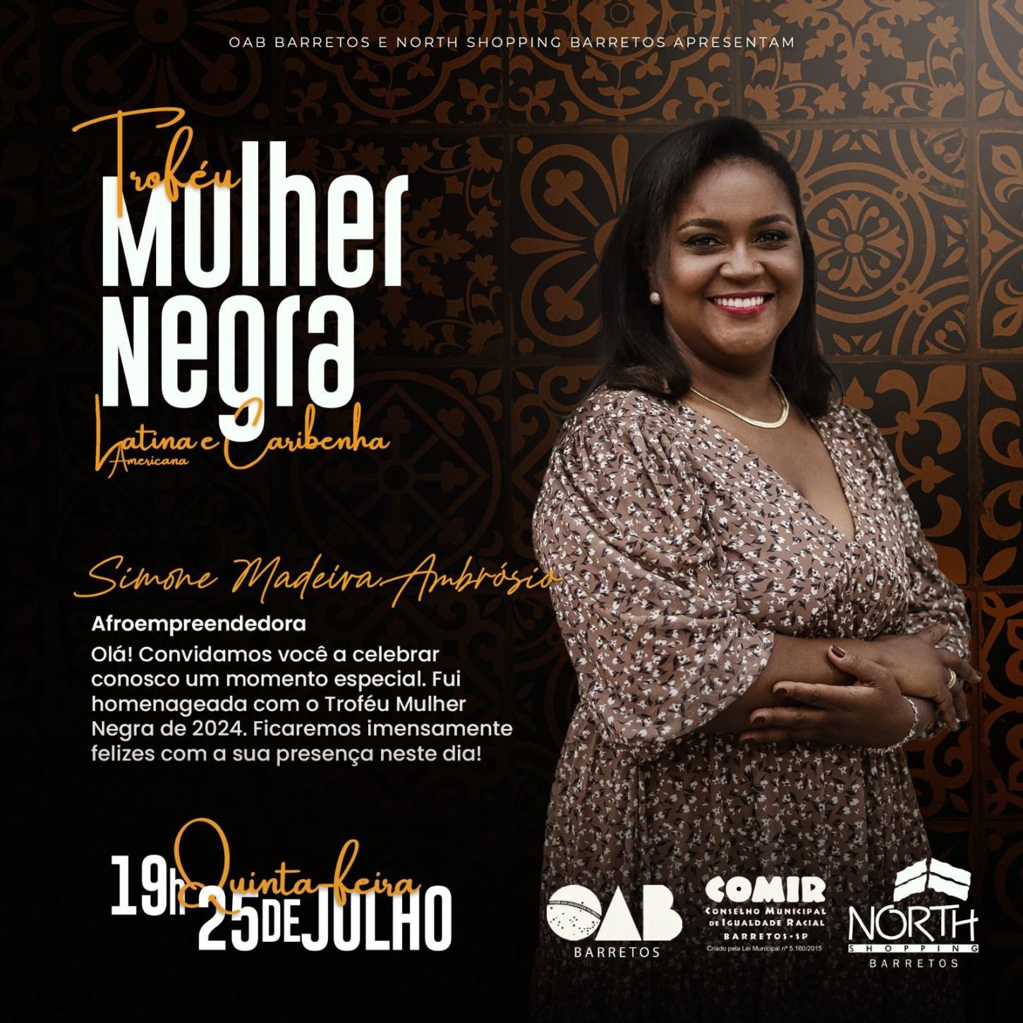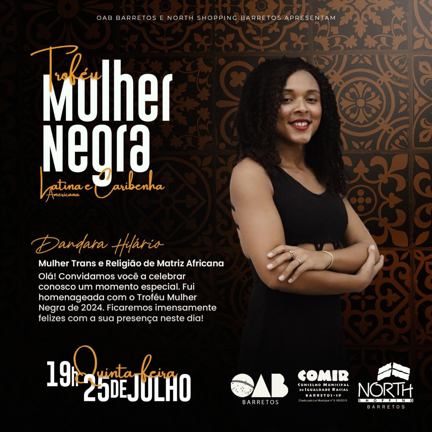 Dez mulheres, com diferentes trajetórias de vida, recebem a homenagem fo “Troféu Mulher Negra Latino-americana e Caribenha 2024”, neste dia 25 de julho, no North Shopping Barretos. A ação celebra a data internacional da "Mulher Negra, Latino-americana e Caribenha” e está em sua terceira edição, realizada neste ano pela Comissão das Mulheres Advogadas da OAB Barretos, em parceria com o COMIR - Conselho Municipal de Igualdade Racial e o North Shopping Barretos.
