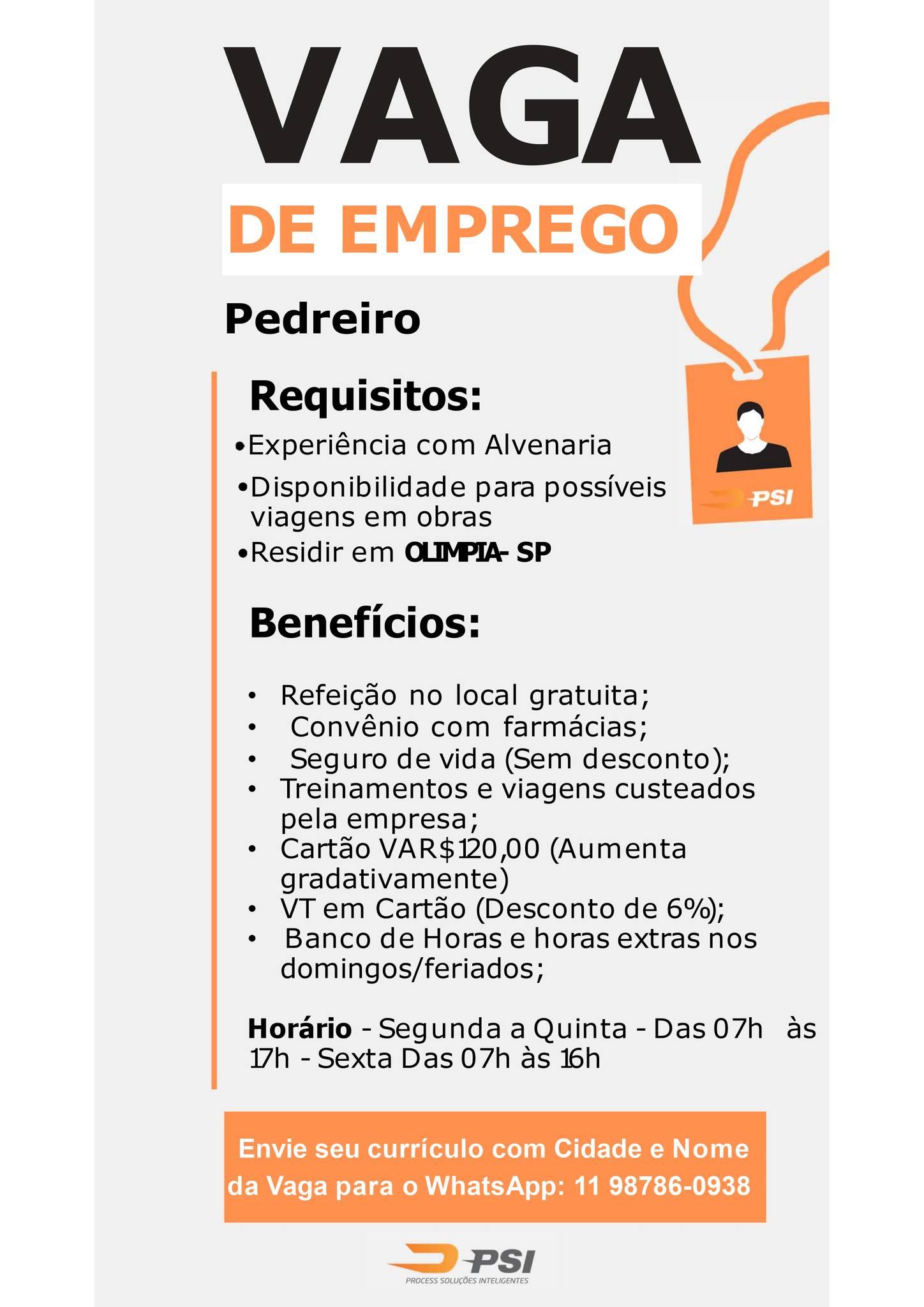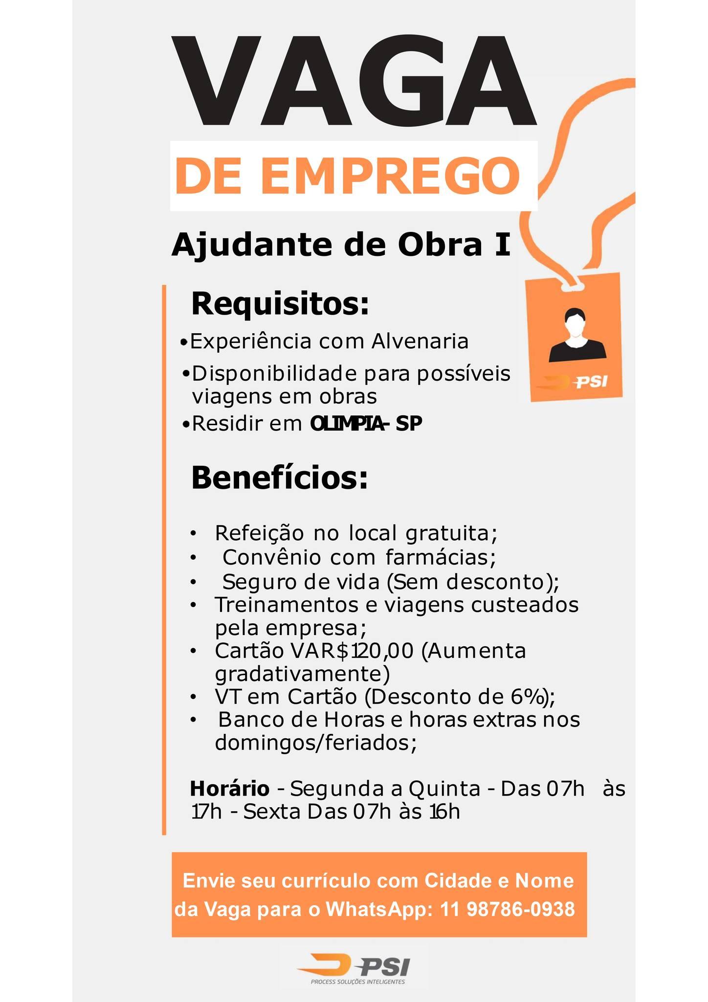 📩 Interessados para todas as vagas devem enviar o currículo com a cidade e nome da vaga para o WhatsApp: (11) 98786-0938 ou entregar pessoalmente na ACIO - Associação Comercial e Industrial de Olímpia, na Rua São João, 880, no centro de Olímpia.